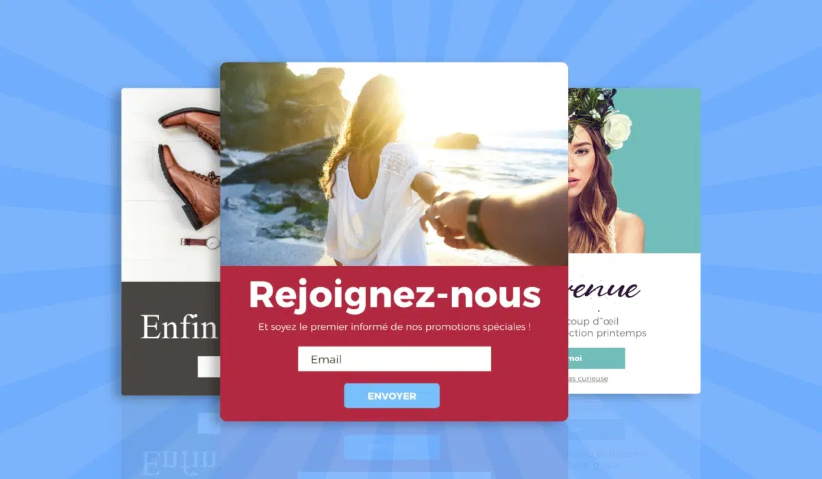 On voit très souvent apparaître, dans cette fenêtre pop up, un formulaire de contact. Il existe plusieurs types de pop ups : un pop up inscription newsletter, pop up pour télécharger un livre blanc, pour s’inscrire à un webinaire, ou tout simplement pour annoncer une remise sur un produit.